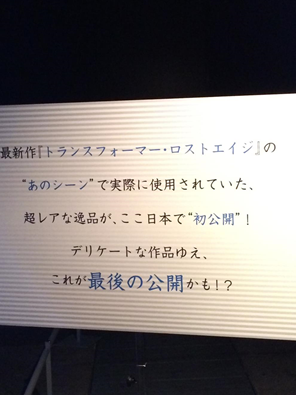 入場するとトランスフォーマーの歴史を作品ごとのオプティマスプライム(コンボイ)とメガトロンを並べている展示物等がありました。ただ私はどちらかといえば実写版の1作目のトランスフォーマーの予告に心奪われたものなので、実写版関係の写真ばかり撮ってしまいましたorz